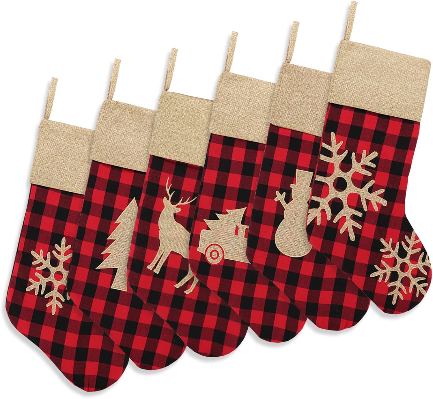 ORIGINAL DESIG: 6 pack of buffalo plaid Christmas stockings with different patterns. Classic red and black plaid Xmas stockings ornaments are full of festival atmosphere, perfect for Xmas trees, fireplaces, stairs, and as Christmas gifts for friends and family.